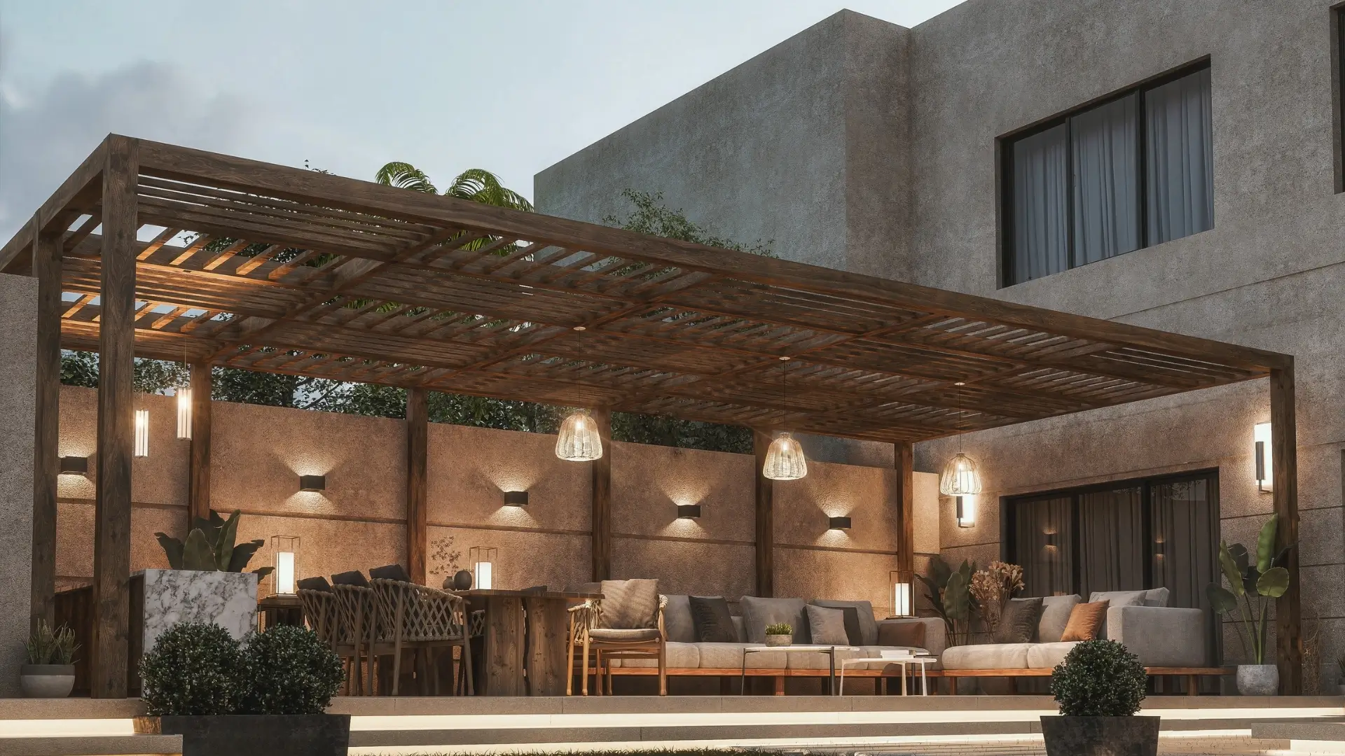 Ambient lighting, on the other hand, is about mood. This type of lighting invites relaxation and socialization. Use warm white tones (around 2700K–3000K) for sitting areas, pergolas, and patios to create a soft glow. For highlighting architectural features or palm trees, spotlights with neutral tones can be used strategically to add depth and texture.