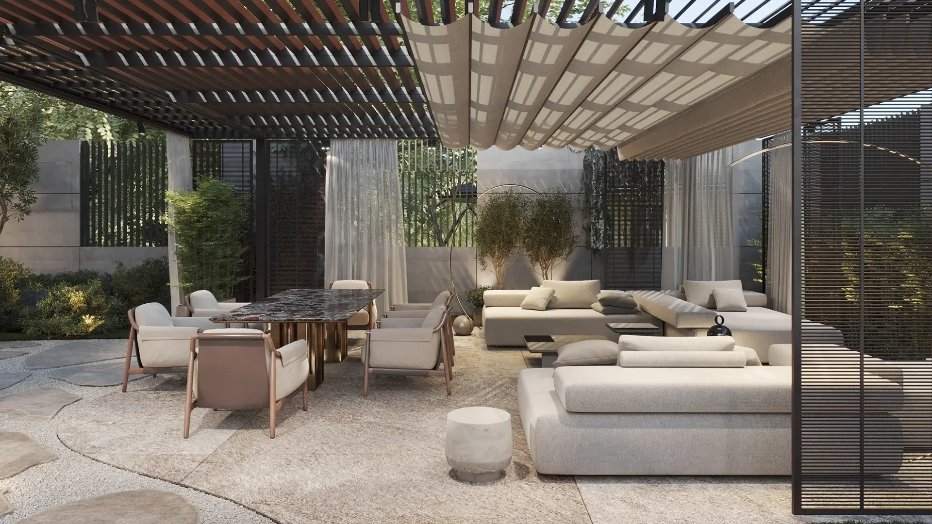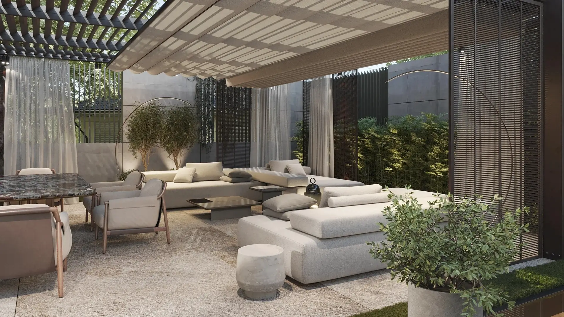 The pergola features a sleek, modern design with clean lines, allowing it to seamlessly integrate with contemporary villa exteriors. Its large size provides ample coverage for outdoor seating, dining areas, and entertainment spaces, offering protection from sun while maintaining excellent ventilation.