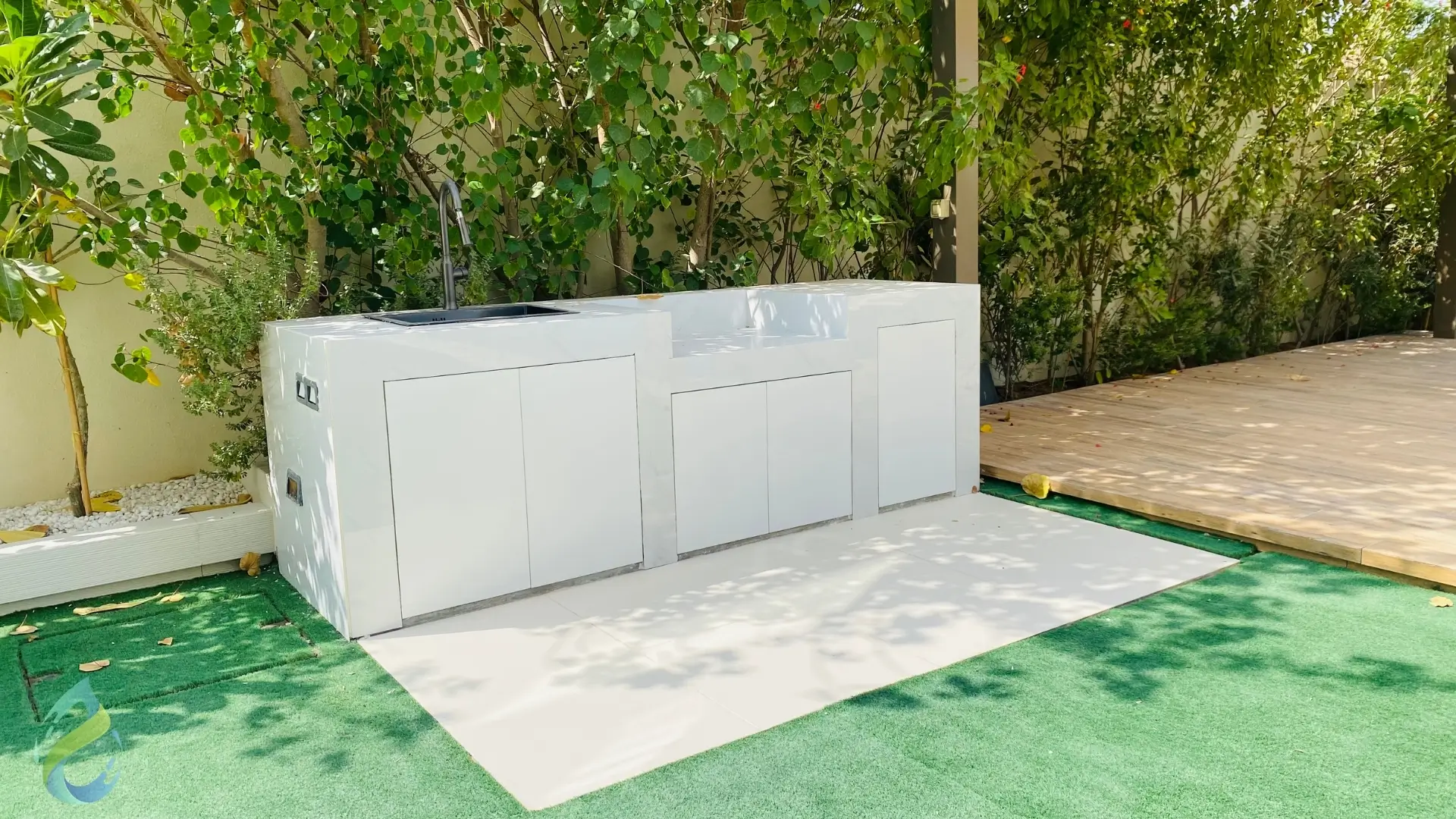 To enhance the outdoor lifestyle further, we designed and built a BBQ and kitchen area, making the garden a perfect venue for family dinners, entertaining guests, or weekend get togethers. Surrounding these features, we installed artificial grass and carefully selected plantation, combining low maintenance greenery with lush, natural appeal.
